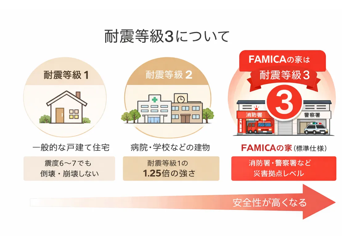 耐震等級3は、消防署や警察署と同等レベルの耐震基準。地震時の倒壊リスクを最小限に抑えます。